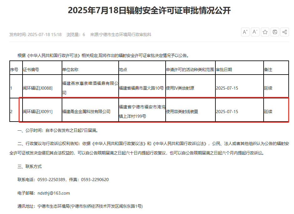 據(jù)顯示,福建甬金金屬科技有限公司使用Ⅲ類射線裝置輻射安全許可證于2025年7月15日獲審批通過。